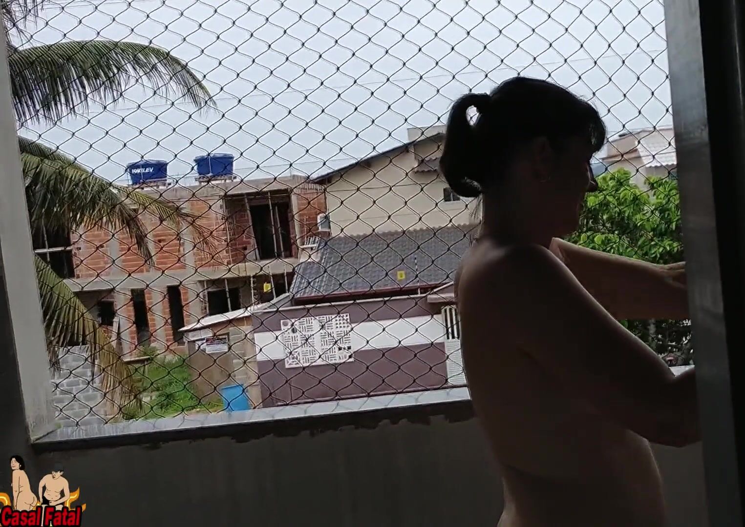 Wife works nude on balcony teasing her cuckold husband