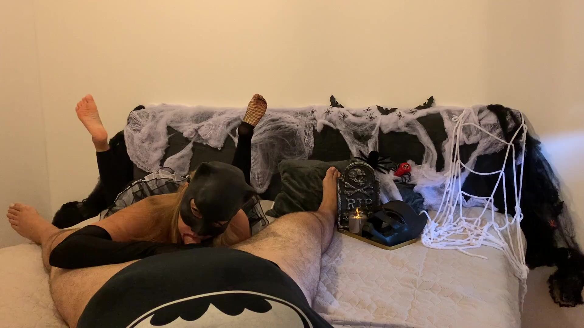 Catwoman revives Batman with hot fuck and great blowjob with facial creampie during Halloween GLOVES